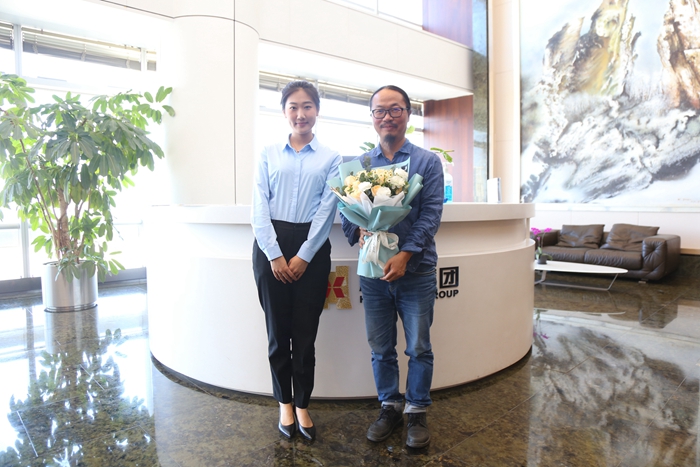 当天下午,集团前台工作人员为杨函憬送上鲜花,迎接他的到来。会议室也布置了许多花砖元素的美食和冰箱贴,供到会同事品尝和领取。