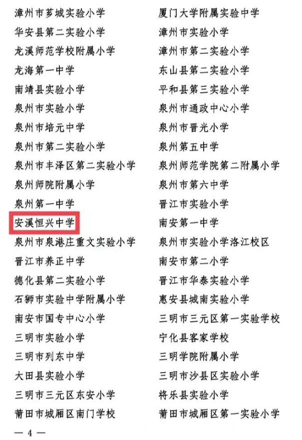 2023年1月,福建省教育厅公布《福建省教育厅关于公布义务教育教改基地校名单的通知》(闽教基〔2023〕1 号),安溪恒兴中学入选福建省首批义务教育教改基地校名单。
