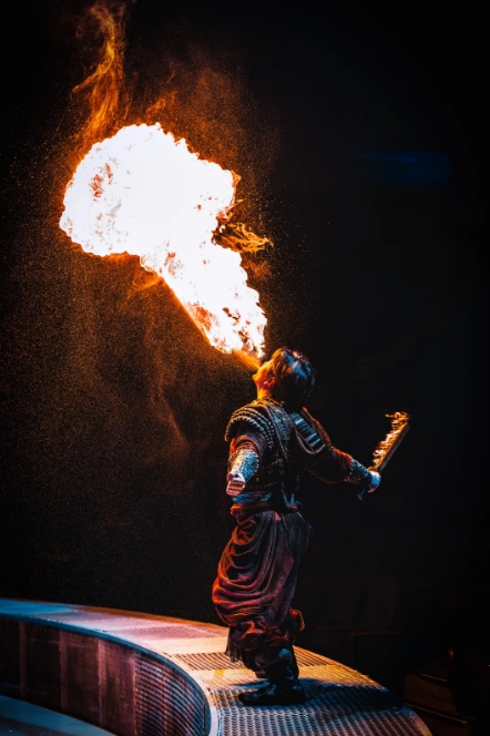 “本次升级,我们采用“天幕地屏+激光投影”的立体舞台设计,打破了传统演出的空间限制,给观众带来前所未有的沉浸式体验。”导演闵锐接受采访时说,“《王的战车》以北方部落的古老传说为蓝本,将传统技艺与现代科技巧妙融合。比如缦吊演员的表演象征着部落信仰的升华,而喷火表演则象征着勇士的炽热斗志。整场演出既保留了传统杂技的力量与惊险,又通过全息投影技术等科技手段赋予其全新的艺术表达,希望观众在观演的过程中,除了感受到震撼,也能体会到中国传统文化的深厚底蕴与传承。